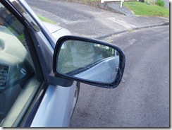 Finally, I decided to do something about it. I took my fly spray. I sprayed on the gap around the mirror. Nothing happened. After all, there are a lot of space behind the mirror. I started the car to get my grocery. Maybe this is not the best way. I was thinking. Maybe I should use a stick or something. But suddenly, something black appeared on my mirror. It was him! He was huge like a soy bean. He had strong but short legs. He was in deep panic. I could see he did not what to do next. Just a second, he felled down to the street. He is gone...